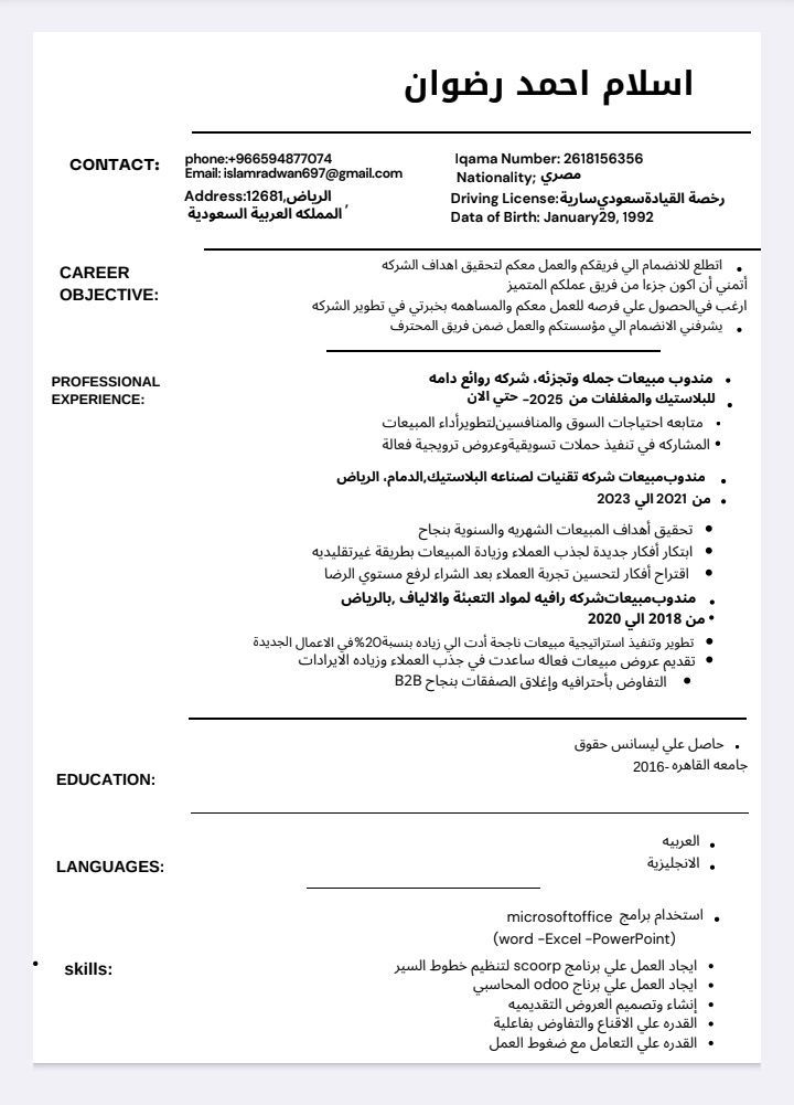 Am a sales representative with a valid Saudi driver's license, seeking employment and a valid residency permit under the profession of sales representative. I am ready to start work immediately