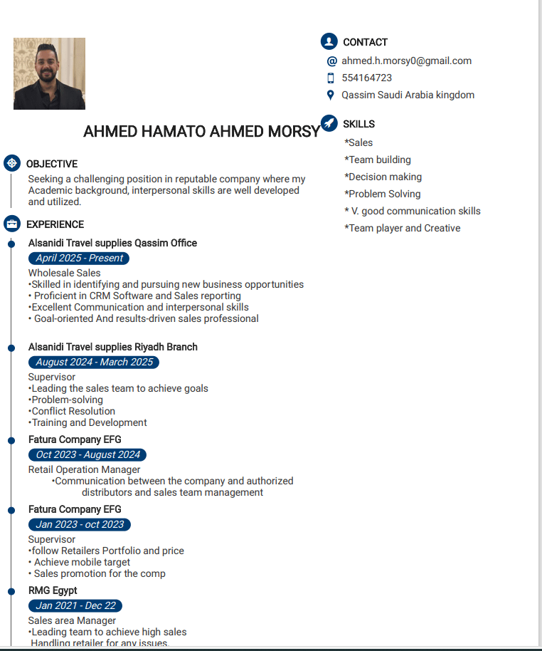 أنا شخصية متميزة في مجال المبيعات، بتمتع بخبرة تمتد لأكثر من 11 سنة. عرف بقدرتي على البيع وادارة المبيعات وتقديم نتائج مميزة فيا لمبيعات. أسعى دائما الى تطوير مهاراتي وتوسيع خبراتي بما يواكب أحدث الأساليب والتقنيات، وأتميز بروح المبادرة والعمل بروح الفريق