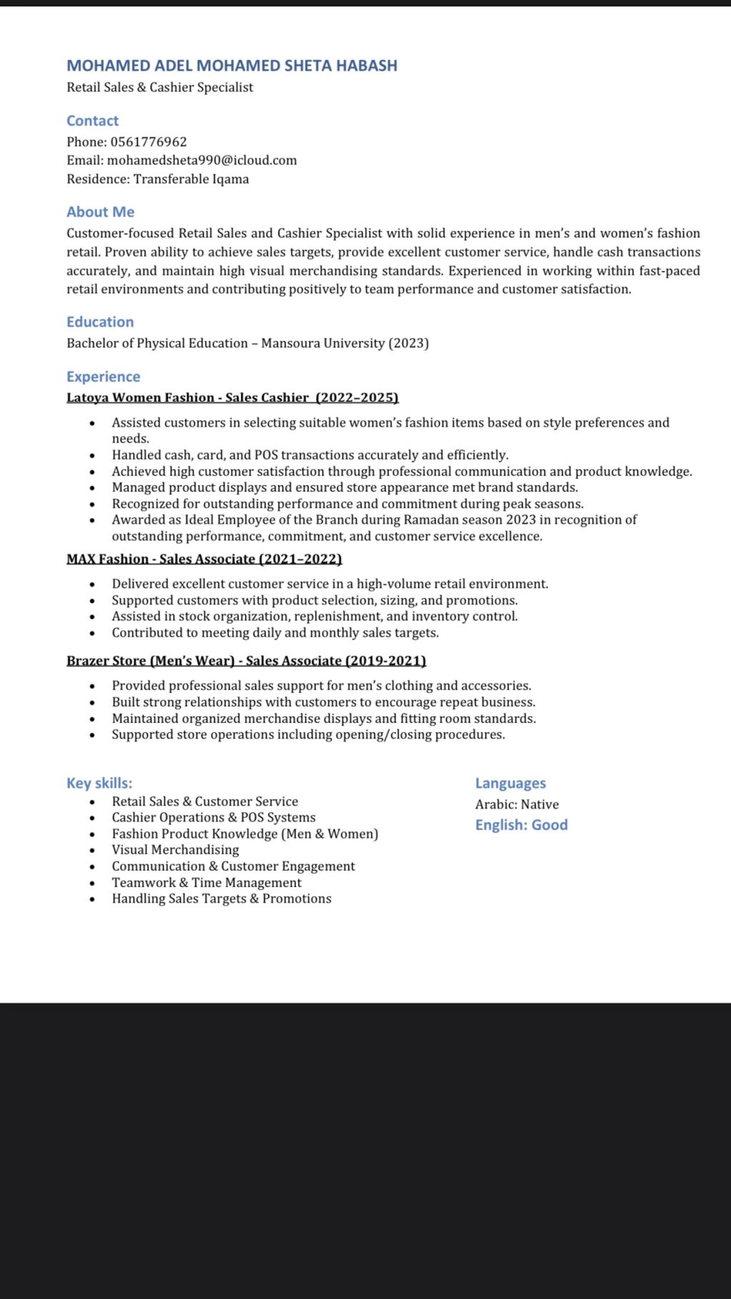 خبرة 6 سنوات في مجال الملابس الرتيل البيع بالتجزئة حاصل علي شهادة خبرة في السيلز بالاضافة الى كفاءة ادخال البيانات وال Visual Merchandising