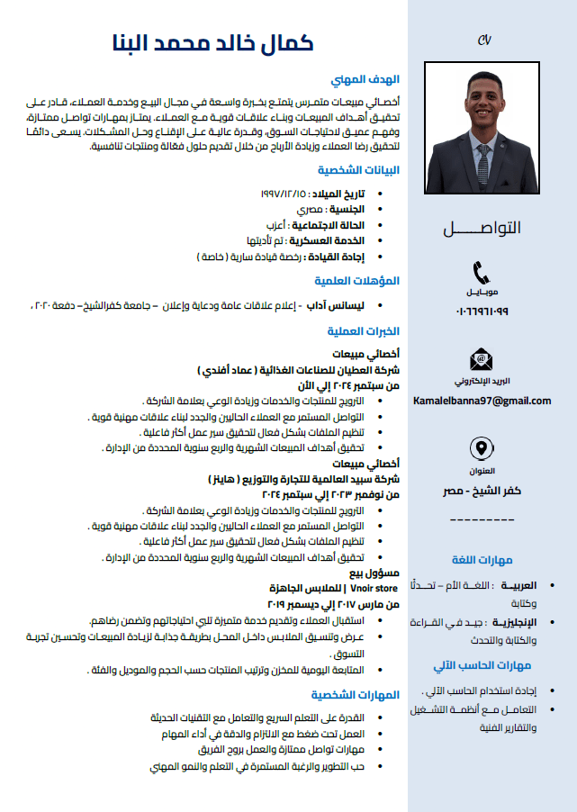 أخصائي مبيعات متمرس يتمتع بخبرة واسعة في مجال البيع وخدمة العملاء، قادر على تحقيق أهداف المبيعات وبناء علاقات قوية مع العملاء، يمتاز بمهارات تواصل ممتازة وفهم عميق لاحتياجات السوق، وقدرة عالية على الاقناع وحل المشكلات. يسعى دائما لتحقيق رضا العملاء وزيادة الأرباح من خلال تقديم حلول فعالة ومنتجات تنافسية