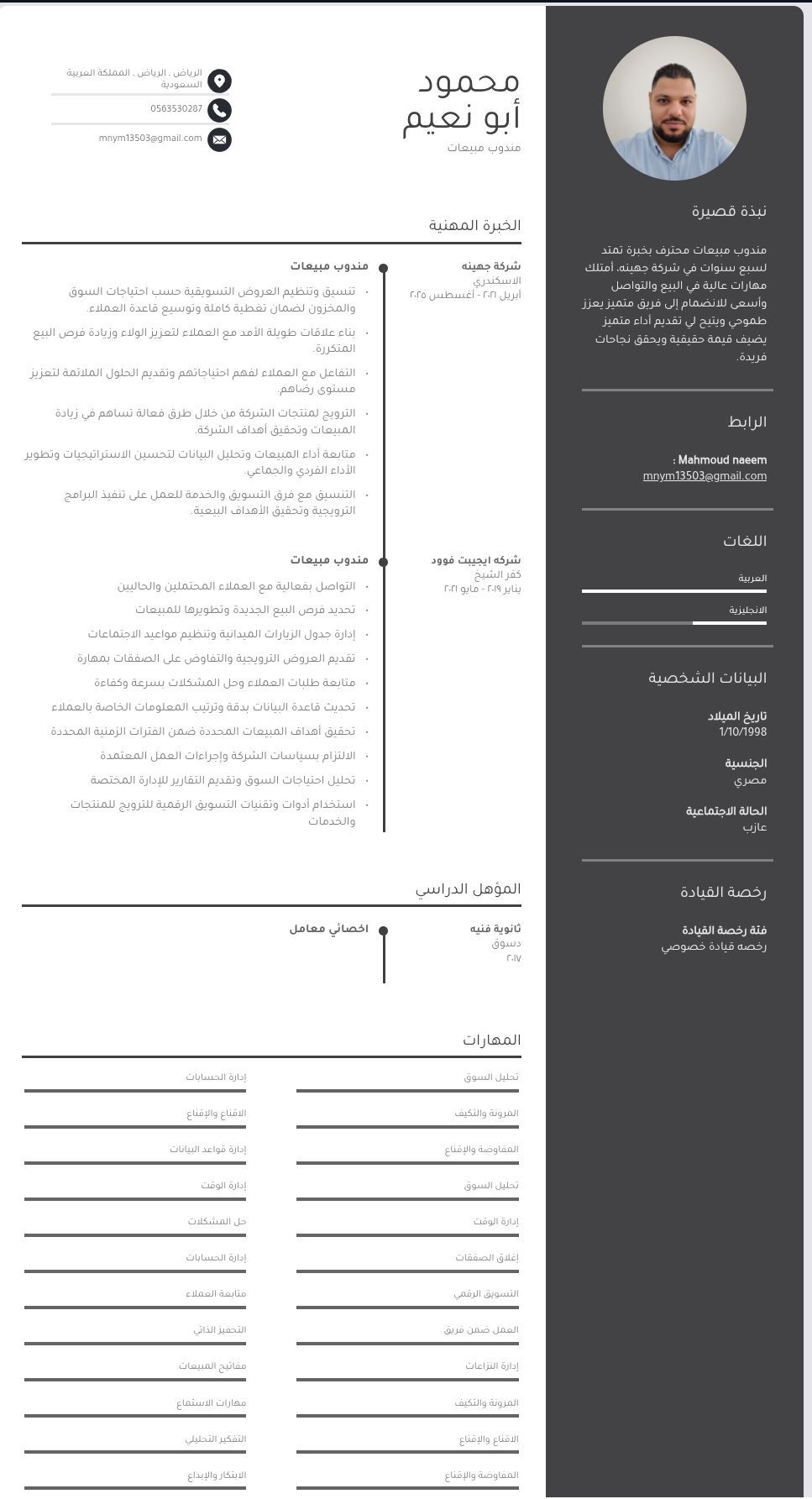 مندوب مبيعات لديه خبرة سابقة في التسويق والتوزيع، امتلك رخصة قيادة سارية وخبرة في القيادة لمسافات طويلة وداخل المدن. متمكن من التعامل مع الزبائن وزيادة المبيعات وإدارة الفواتير ابحث عن عمل في شركة طموحة. إقامة سارية ومتاح نقل كفالة. مدينة الرياض مصري الجنسية