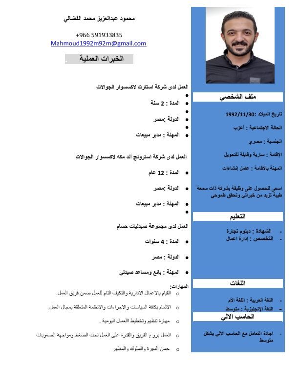 عندى خبرة في مجال المبيعات الأكسسوارات الجولات أقدر أكون في أي حاجة