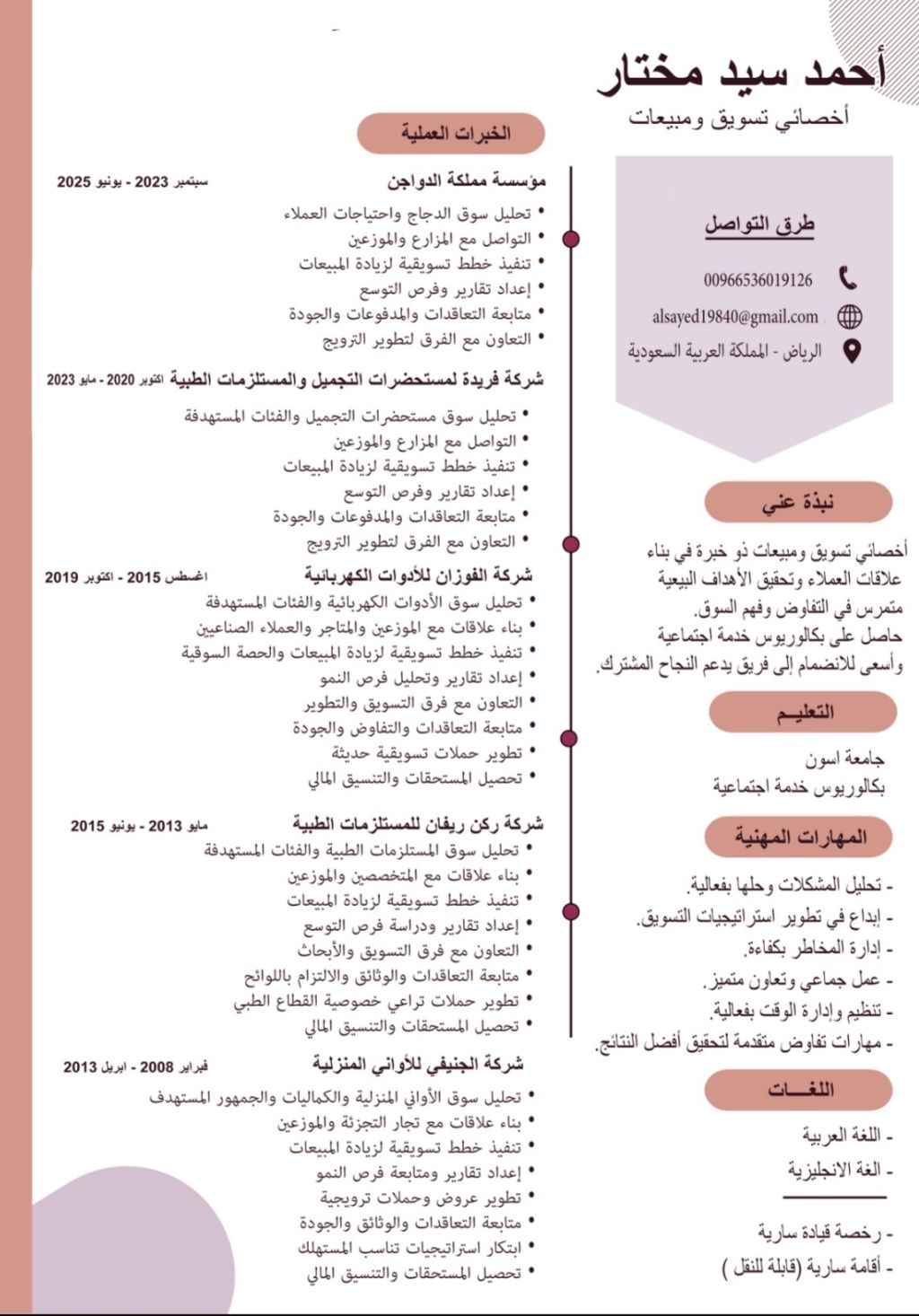 مندوب مبيعات وتسويق خبرة طويلة بالمبيعات، ابحث عن وظيفة في المبيعات والتسويق متواجد في الرياض ولا يوجد مانع العمل بأي مكان بالمملكة
