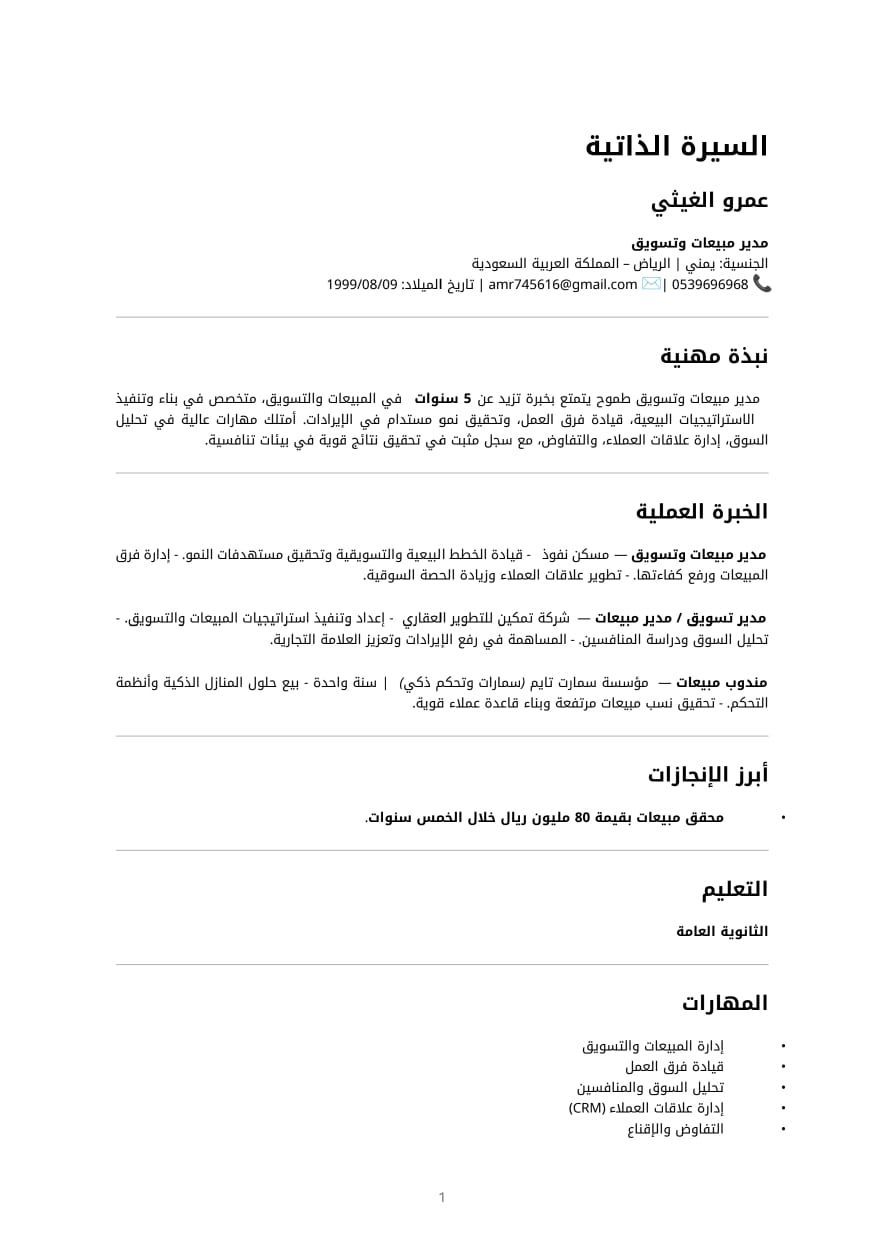 مدير مبيعات وتسويق محترف يتمتع بخبرة في قيادة وتطوير استراتيجيات المبيعات والتسويق، وتحقيق نمو ملحوظ في الايرادات وبناء علامات تجارية قوية. متخصص في تحليل الأسواق، إدارة علاقات العملاء، تطوير القنوات البيعية، وقيادة فرق العمل بكفاءة عالية لتحقيق الأهداف الاستراتيجية. امتلك رؤية تجارية واضحة وقدرة على تحويل الفرص الى نتائج ملموسة في بيئات عمل تنافسية