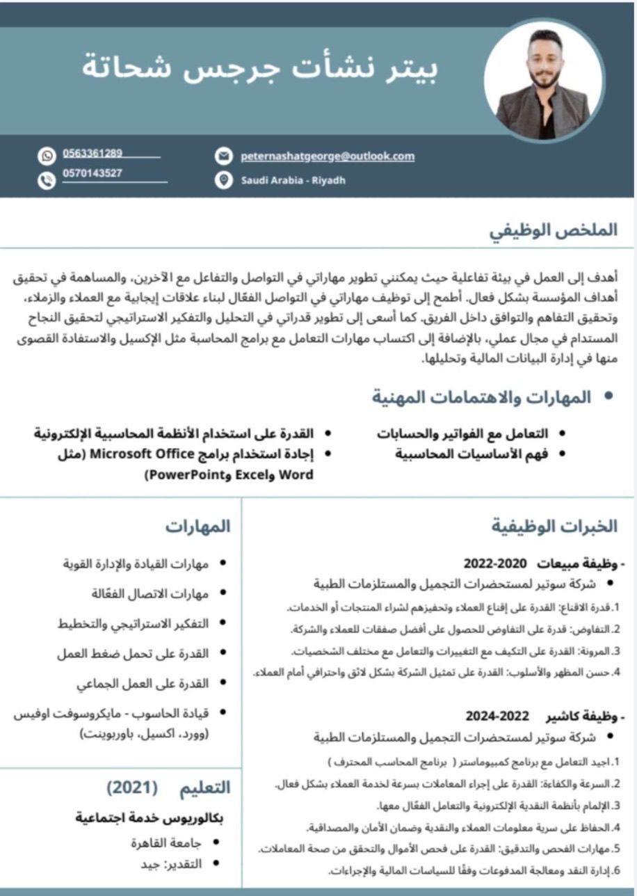 ابحث عن عمل في مجال المبيعات والتسويق كنت اعمل مسؤول مشتريات في شركة مقاولات في الرياض كنت اعمل سيلز في محل تجاري في الرياض كنت اعمل من قبل كاشير في الرياض وكنت اعمل مسؤول مبيعات في شركة ركن العناية لمستحضرات التجميل والعناية بالبشرة هدفي كان تحقيق للشركات التارجت وجلب عملاء جدد ومشاريع للشركة ورفع نسبة المبيعات للشركة عندي مهارة التعامل مع العملاء وإقناعهم بالشراء مصري خريج جامعي عمري 27 سنة