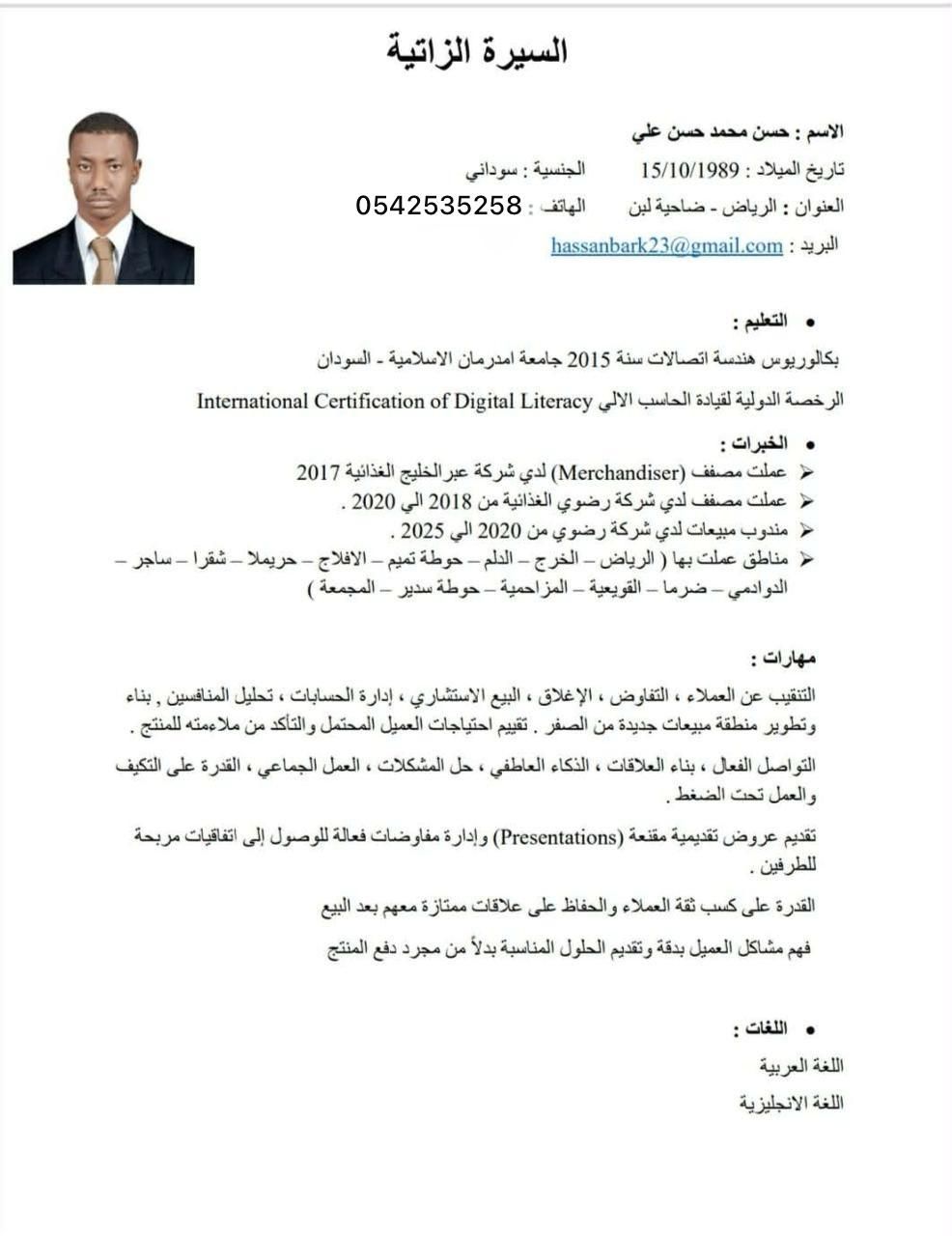 My name is Hassan Mohamed, and I am a Sales Representative based in Riyadh, Saudi Arabia, with over 9 years of experience in the FMCG industry. Throughout my career, I have gained strong experience in sales operations, market development, merchandising, and building strong relationships with retailers and key accounts. I have worked closely with different supermarkets and distribution