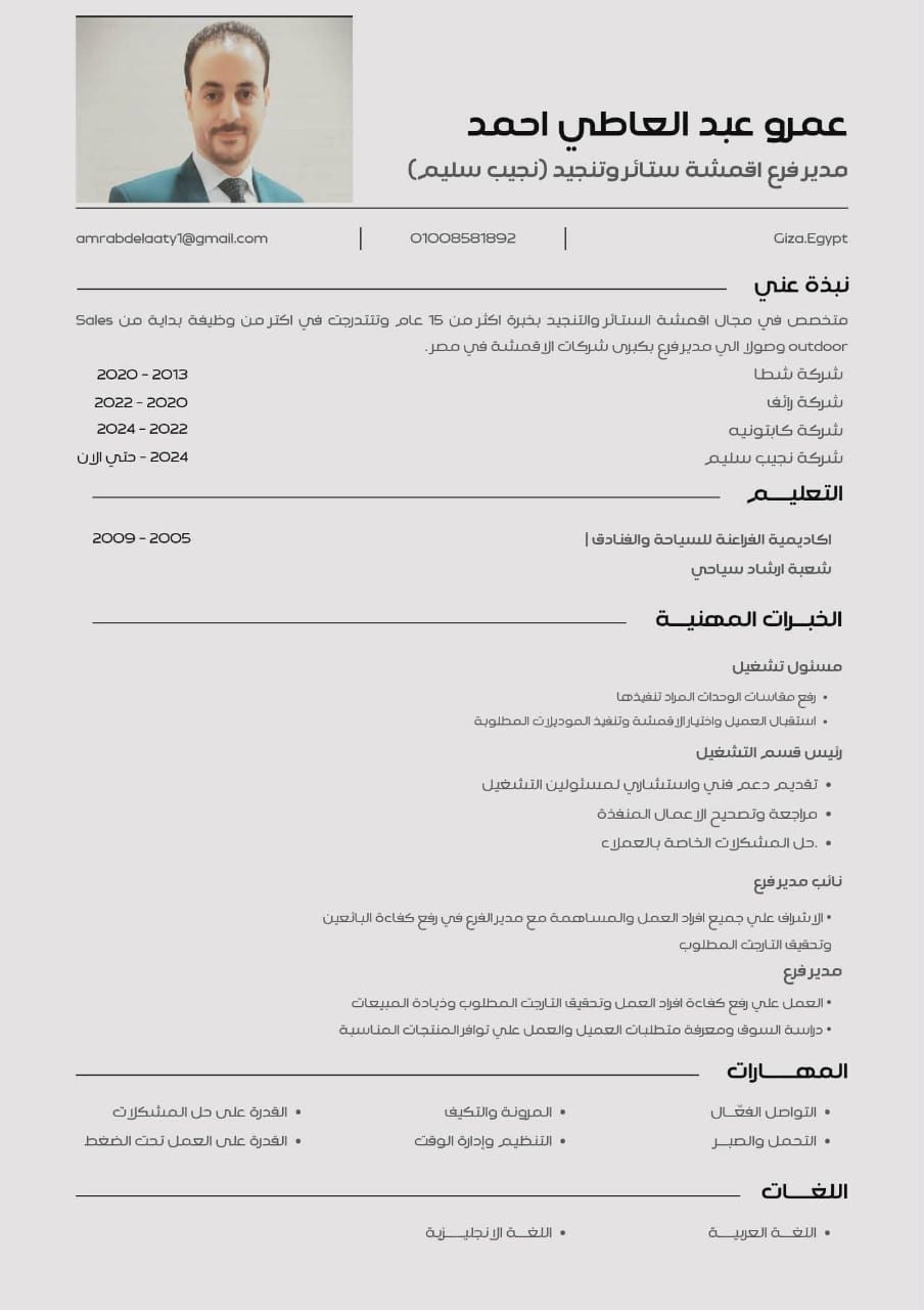Sales & Operations Supervisor with 15 + years in fabrics and curtains. Expert in strategic sales planning, team leadership, and achieving targets. Proven track record in managing daily operations, optimizing costs, and driving workflow efficiency. Skilled in business development, client retention, and staff training to maximize market share and ensure the achievement of corporate goals