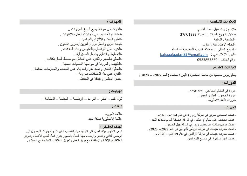 الاسم بهاء نبيل أحمد ناجي القد سي العمر 28 الجنسية يمني ابحث عن عمل مندوب مبيعات لدي رخصة خصوصي ورخصة نقل خفيف وإقامة سارية لتاريخ 2026 / 7/ 28