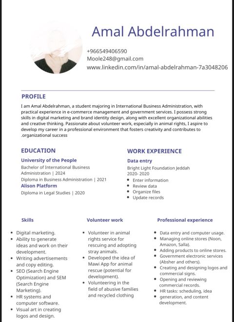 أنا مساعدة ادارية أو موظفة مبيعات أو تسويق خريجة عندي خبرة بسيطة في التسويق والمبيعات وادارة المتاجر الالكترونية وبعض الخدمات الالكترونية الأخرى الرجاء من تتوفر لديه فرصة عدم التردد بالتواصل معي - الرياض