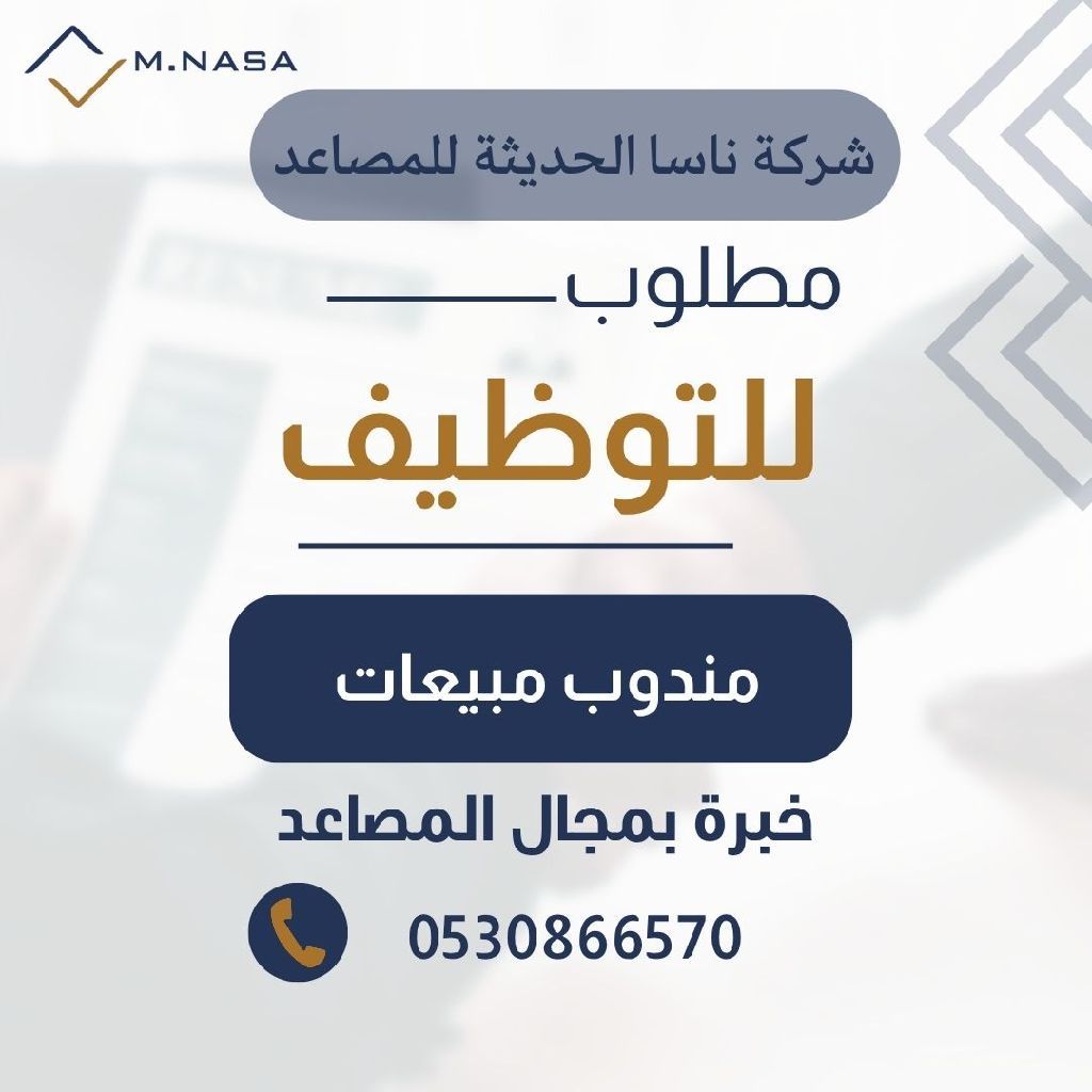 مطلوب للعمل فورا بشركة ناسا الحديثة للمصاعد مندوب مبيعات خبرة بمجال المصاعد في الرياض شارع العليا. يرجى ارسال أل CV واتساب وسيتم تحديد موعد للمقابلة في أقرب وقت