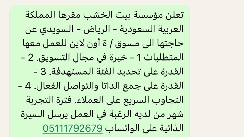 تعلن مؤسسة بيت الخشب مقرها المملكة العربية السعودية - الرياض - السويدي عن حاجتها الى مسوق / ة أون لاين للعمل معها في تسويق الأواني الخشبية المتطلبات 1 - خبرة في مجال التسويق. 2 - القدرة على تحديد الفئة المستهدفة. 3 - القدرة على جمع الداتا والتواصل الفعال. 4 - التجاوب السريع على العملاء. فترة التجربة شهر من لديه الرغبة في العمل يرسل السيرة الذاتية على الواتساب 05111792679