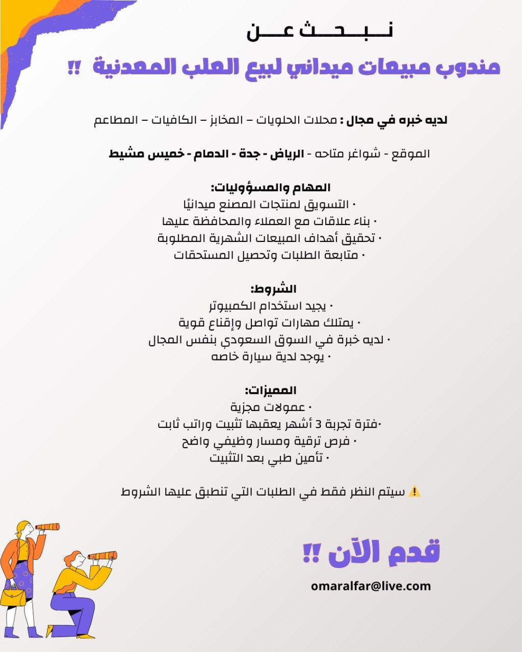فرصة وظيفية مميزة لزيادة الدخل الشهري يعلن مصنع العلب المعدنية - حي سديره عشير - منطقة الرياض عن توفر وظيفة شاغرة بمسمى مندوب مبيعات ميداني - بشكل عاجل المجال محلات الحلويات - المخابز - الكافيهات - المطاعم الموقع شواغر متاحة في أغلب مدن المملكة الرجاء عدم الاتصال لن يتم الرد اتصال - فضلا عدم تضيع الوفت - فقط إرسال السيرة الذاتية