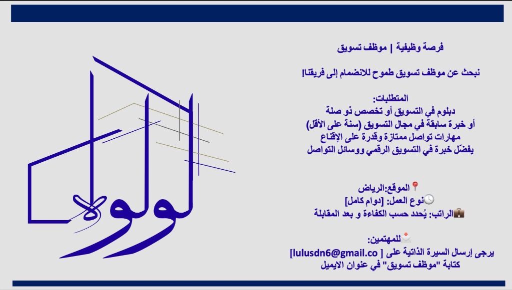 مطلوب موظفة تسويق لديها الخبرة بالتسويق الرقمي وبرامج السوشيال ميديا، ويشترط الخبرة بالتواصل مع العملاء ومهارة التفاوض وصناعة عملاء محتملين. للعمل بمدينة الرياض حي المروج. ترسل السيرة الذاتية باللغة العربية على الواتساب والايميل. التوظيف فوري