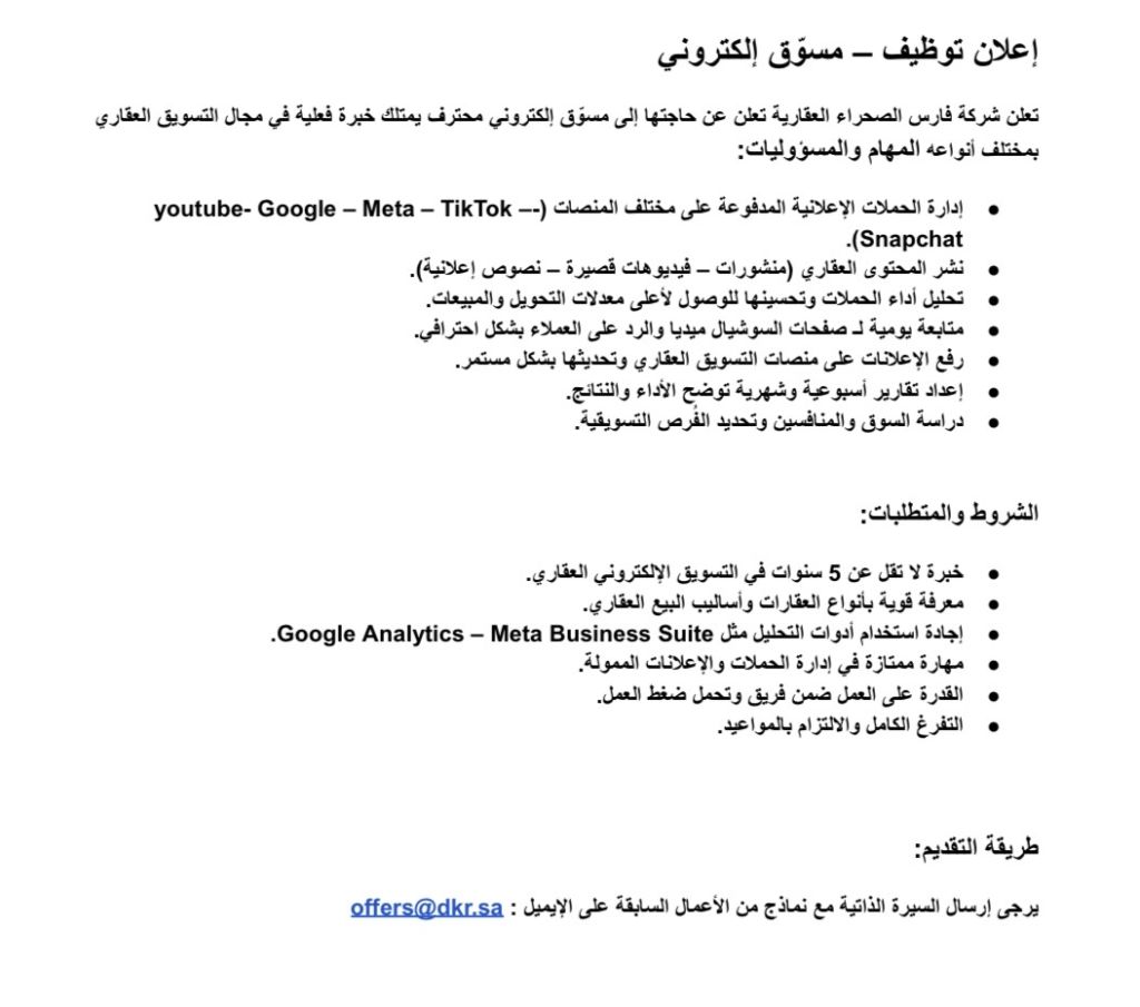 تبحث شركة فارس الصحراء العقارية عن مسوق الكتروني محترف بخبرة لا تقل عن 5 سنوات المهام الأساسية إدارة وتحليل وتحسين الحملات الاعلانية المدفوعة على المنصات نشر المحتوى العقاري (فيديوهات، منشورات، نصوص) متابعة يومية لصفحات السوشيال ميديا اعداد تقارير الأداء ودراسة السوق والمنافسين. معرفة قوية بأساليب البيع العقاري وأنواعه. مهارة إدارة الاعلانات الممولة - مقر العمل الرياض - حي القادسية
