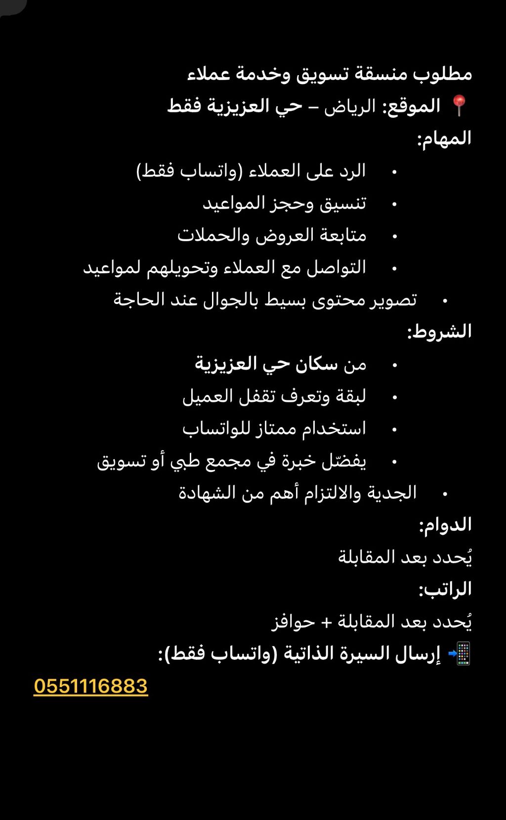 مطلوب منسقة تسويق وخدمة عملاء الموقع الرياض - حي العزيزية فقط المهام الرد على العملاء (واتساب فقط) تنسيق وحجز المواعيد - متابعة العروض والحملات - التواصل مع العملاء وتحويلهم لمواعيد - تصوير محتوى بسيط بالجوال عند الحاجة الشروط من سكان حي العزيزية - لبقة وتعرف تقفل العميل - استخدام ممتاز للواتساب - يفضل خبرة في مجمع طبي أو تسويق - الجدية والالتزام أهم من الشهادة الدوام يحدد بعد المقابلة الراتب