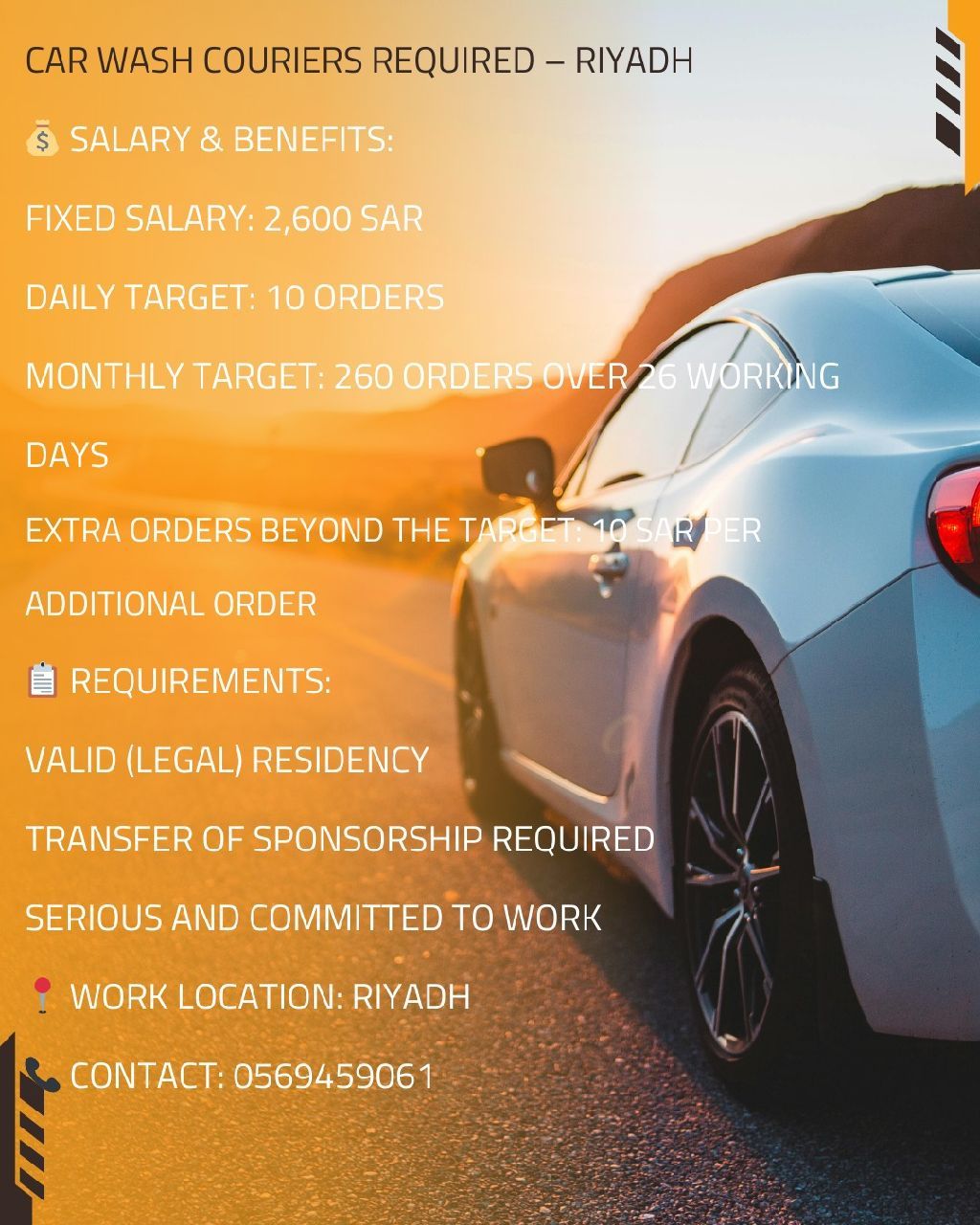 مطلوب مناديب غسيل سيارات - الرياض الراتب والمميزات راتب ثابت 2600 ريال المطلوب 10 طلبات يوميا اجمالي 260 طلب خلال 26 يوم عمل أي طلب زيادة عن التارجت 10 ريال على كل طلب اضافي الشروط إقامة نظامية نقل كفالة الجدية والالتزام في العمل مكان العمل الرياض حي الملز