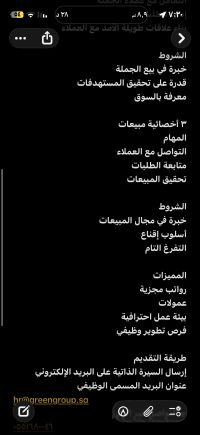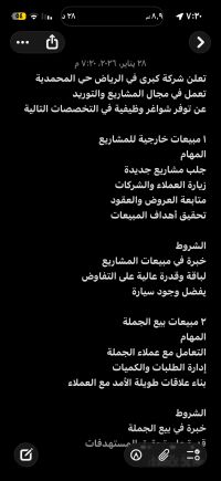 مبيعات خارجية للمشاريع المهام جلب مشاريع جديدة زيارة العملاء والشركات متابعة العروض والعقود تحقيق أهداف المبيعات 2 مبيعات بيع الجملة المهام التعامل مع عملاء الجملة إدارة الطلبات والكميات بناء علاقات طويلة الأمد مع العملاء 3 أخصائية مبيعات المهام التواصل مع العملاء متابعة الطلبات تحقيق المبيعات الرياض حي المحمدية
