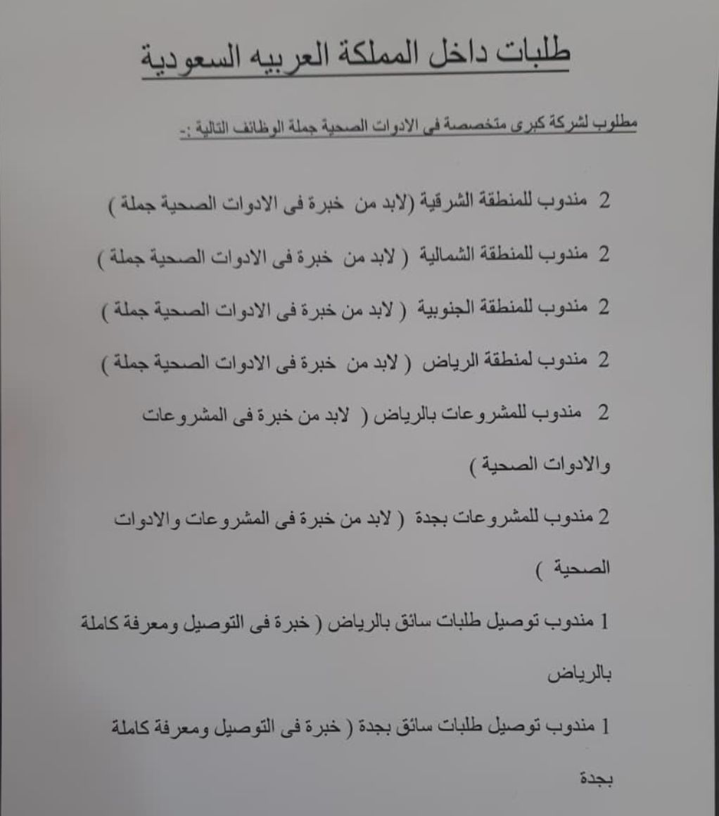 نحن شركة أدوات صحية work zon الرياض حي طويق بحاجة الى مناديب مبيعات ومشاريع في الرياض ومناطق أخرى دخل المملكة بخبرة في مبيعات الأدوات الصحية لا تقل عن ثلاث سنوات برجاء قراءة الاعلان ولا يرسل غير الذي تنطبق عليه الشروط وعدم الاتصال مع كامل التحية