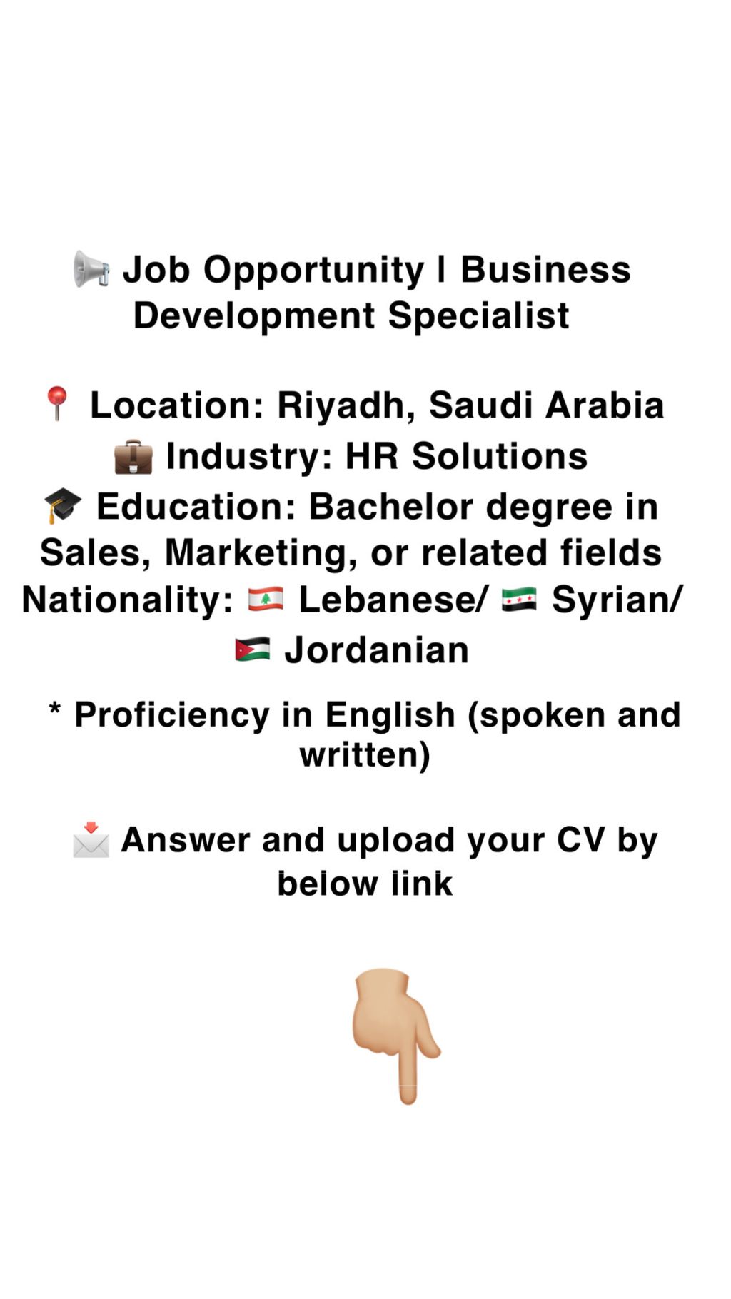 Job Opportunity Business Development Specialist Location Riyadh, Saudi Arabia Industry HR Solutions Education Bachelor degree in Sales, Marketing, or related fields Nationality Lebanese/ Syrian/ Jordanian Proficiency in English (spoken and written) Answer and upload your CV here
