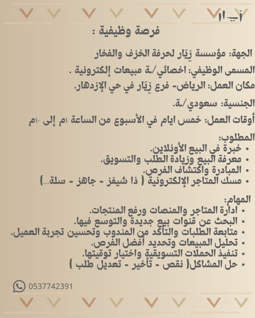 أخصائي/ ة مبيعات الكترونية. الجهة مؤسسة زيار لحرفة الخزف والفخار الجنسية سعودي / ة مكان العمل الرياض - فرع زيار في حي الازدهار. أوقات العمل خمس أيام في الأسبوع من الساعة 1م الى 10م المطلوب خبرة في البيع الاونلاين. معرفة البيع وزيادة الطلب والتسويق. المبادرة واكتشاف الفرص. مسك المتاجر الالكترونية