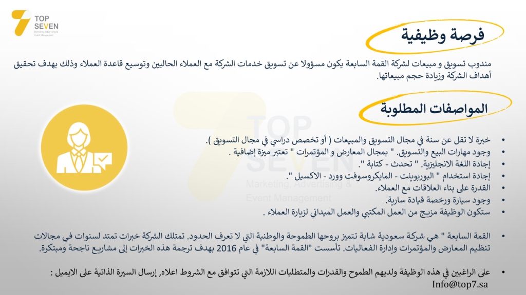وظيفة شاغر مندوب تسويق / مبيعات في شركة Top7 لتنظيم المعارض والمؤتمرات في مدينة الرياض حي المصيف طريق الملك عبدالعزيز