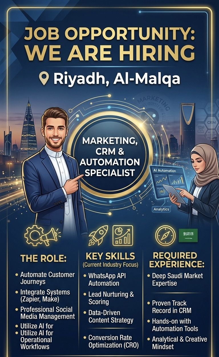 مطلوب متخصص Marketing, CRM & Automation في الرياض (حي الملقا) يمتلك خبرة بالسوق السعودي في اتمتة رحلات العملاء وربط الأنظمة، مع إدارة احترافية لمنصات التواصل الاجتماعي وتوظيف الذكاء الاصطناعي في العمليات وتتمثل مهاراته الأساسية في إدارة حملات الواتساب، واتمتة المهام التشغيلية، وصناعة محتوى رقمي مدعوم بالبيانات لرفع التفاعل وتحويل العملاء
