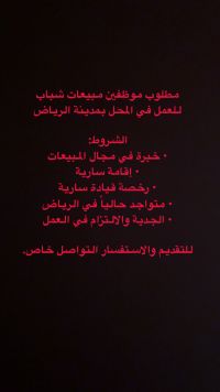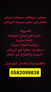 مطلوب موظفين مبيعات ذو خبرة سابقه للعمل في شركة تموين مواد غذائية للمطاعم حي الروابي مخرج 14 / الرياض