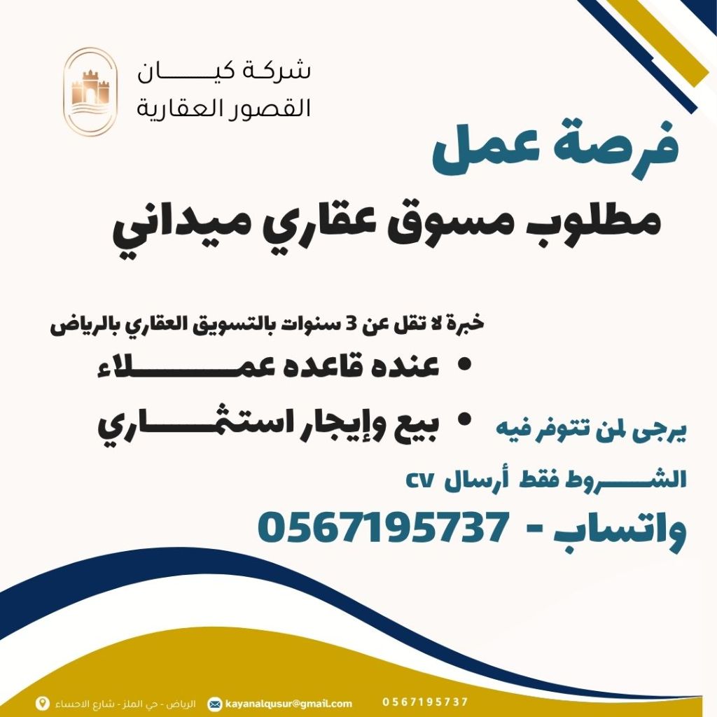 مطلوب مسوق عقاري خبرة بالسوق العقاري السعودي وخاصه في الرياض عنده قاعدة عملاء وخبرة لا تقل عن 3 سنوات. نشيط وحسن التعامل وخبرة في اتمام الصفقات (بيع وإيجار عمارات استثمارية) فضلا اللي تتوفر فيه الشروط فقط التواصل على الرقم وإرسال السيرة الذاتية