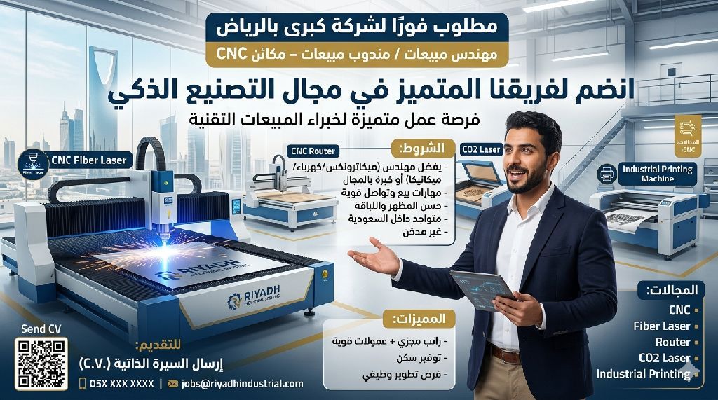 مطلوب مهندس / مندوب مبيعات - مكائن CNC شركة كبرى مقرها الرياض حي الروضة تطلب مهندس مبيعات أو مندوب مبيعات في مجال مكائن CNC، الفايبر لايزر، الراوتر، لايزر CO2، ومكائن الطباعة الصناعية الشروط يفضل مهندس (ميكاترونكس / كهرباء / ميكانيكا) أو خبرة بالمجال مهارات بيع وتواصل قوية حسن المظهر واللباقة غير مدخن المميزات راتب مجزي + عمولات قوية توفير سكن فرص تطوير وظيفي للتقديم أرسل CV