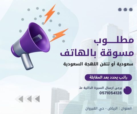 سعودية أو تتقن اللهجة السعودية. مطلوب مسوقة بالهاتف للتواصل مع مقدمي الخدمات. خبرة بالتسويق عبر الهاتف، أسلوب مقنع، طريقة احترافية في التواصل. يرجى من تنطبق عليها الشروط فقط ترسل السيرة الذاتية. العمل في الرياض حي القيروان مدة 3 أيام تدريب بعدها من البيت