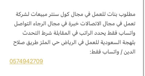 مطلوب بنات للعمل في مجال كول سنتر مبيعات لشركة تعمل في مجال الاتصالات خبرة في مجال الرجاء التواصل واتساب فقط يحدد الراتب في المقابلة شرط التحدث بلهجة السعودية للعمل في الرياض حي الملز طريق صلاح الدين