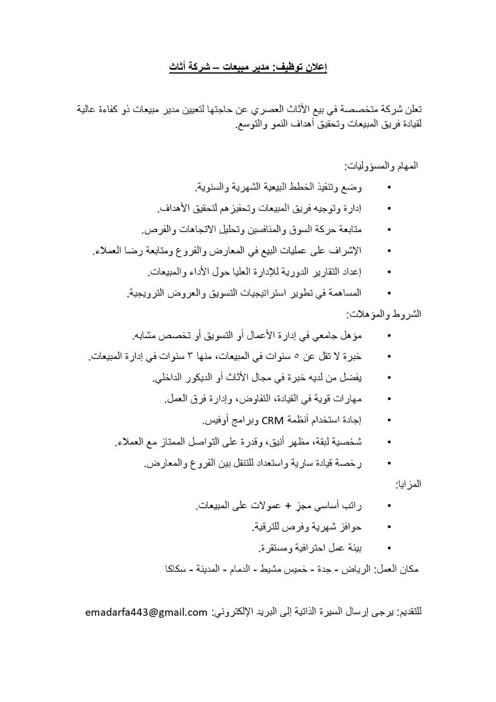 اعلان توظيف مدير مبيعات - شركة أثاث تعلن شركة متخصصة في صناعة وبيع الأثاث العصري عن حاجتها لتعيين مدير مبيعات ذو كفاءة عالية لقيادة فريق المبيعات وتحقيق أهداف النمو والتوسع. المهام والمسؤوليات وضع وتنفيذ الخطط البيعية الشهرية والسنوية. إدارة وتوجيه فريق المبيعات وتحفيزهم لتحقيق الأهداف. متابعة حركة السوق والمنافسين وتحليل الاتجاهات والفرص. الاشراف على عمليات البيع