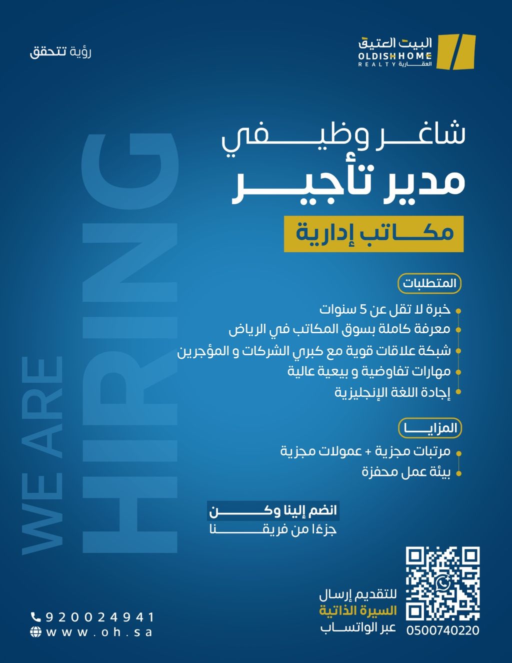 شاغر وظيفي نبحث عن شخص متمكن ويملك الخبرة والمهارة لشغل وظيفة مدير تأجير مكتبي لدى إدارة التأجير في الشركة. خبرة لا تقل عن 5 سنوات - معرفة تامة بسوق الرياض المكتبي - علاقات مع كبرى الشركات والمؤجرين - مهارات تفاوضية وبيعية - لغة انجليزية ممتازة الموقع / الرياض حي النرجس