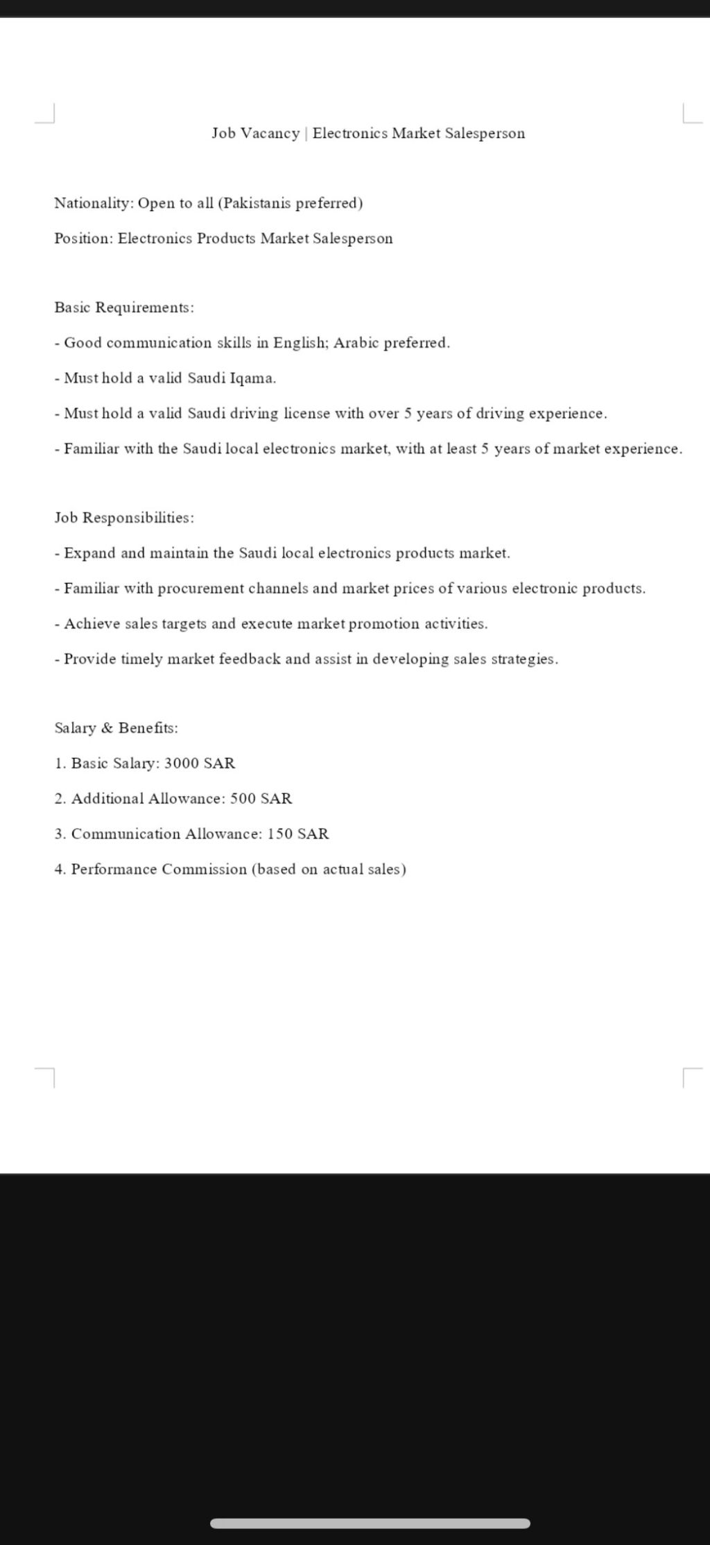 A Chinese company is hiring an Electronics market salesman, in Riyadh, Al - Wadi neighborhood, with 5 years experience in Saudi and holds a valid Saudi Iqama, Knows English well and Arabic is preferred. Basic salary is 3000 SAR650 other allowances. Send your CV to this