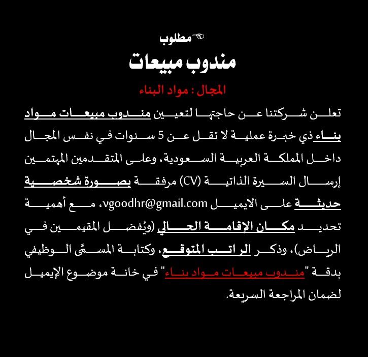 تعلن شركتنا عن حاجتها لتعيين مندوب مبيعات مواد بناء ذي خبرة لا تقل عن 5 سنوات في نفس المجال بالمملكة العربية السعودية، وعلى المتقدمين المهتمين إرسال السيرة الذاتية (CV) مرفقة بصورة شخصية حديثة على الايميل، مع أهمية تحديد مكان الإقامة الحالي (ويفضل المقيمين في الرياض) وذكر الراتب المتوقع، وكتابة المسمى الوظيفي بدقة "مندوب مبيعات مواد بناء" في خانة موضوع الايميل لسرعة المراجعة - العمل في الرياض حي السويدي