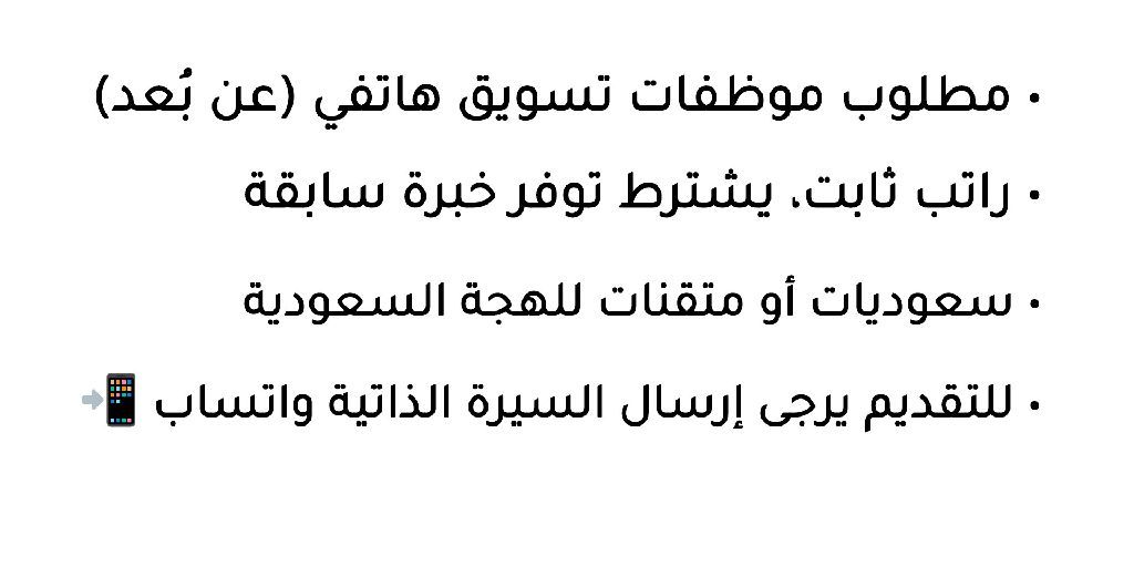 شركة تقنية معلومات بحي السليمانية في الرياض طالبين موظفات تسويق هاتفي عن بعد براتب ثابت يحدد بعد المقابلة ودوام كامل من الأحد الى الخميس جمعه وسبت إجازة شرط توفر خبرة سابقة يرجى إرسال السيرة الذاتية واتساب وعدم الاتصال