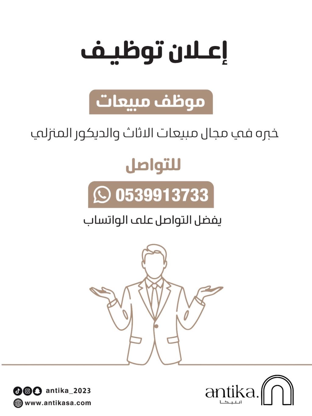 مطلوب موظف مبيعات حسن المظهر ولديه خبرة سابقة بالمبيعات واقناع العميل للعمل في محل تجاري لتحف وديكورات المنزل موقعنا الرياض حي الصحافة، للتواصل