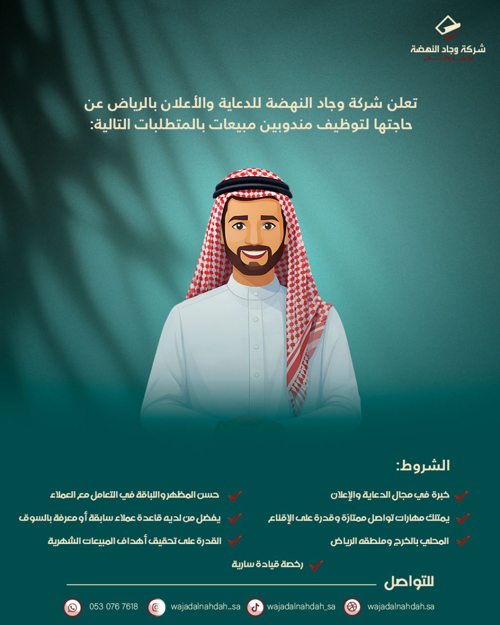 تعلن شركة وجاد النهضة عن حاجتها الى مندوب مبيعات (سعودي / يمني / سوداني) المهام الوظيفية تسويق وبيع منتجات وخدمات الشركة - بناء علاقات قوية مع العملاء - تحقيق أهداف المبيعات الشهرية - متابعة العملاء وتقديم العروض المناسبة الموقع الرياض حي النهضة