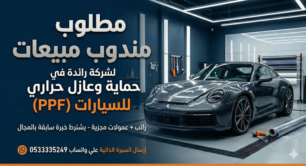 مطلوب موظف تسويق ومبيعات لشركة تعمل في مجال الحماية PPF والعازل الحراري لزجاج السيارات، يشترط خبرة سابقة بالمجال، العمل بحي النرجس مدينة الرياض، يحدد الراتب بعد المقابلة، نظام عمولات نقل كفالة بدل سكن، تنقل، وجميع الحقوق النظامية الأخري، برجاء إرسال السيرة الذاتية واتساب فقط علي