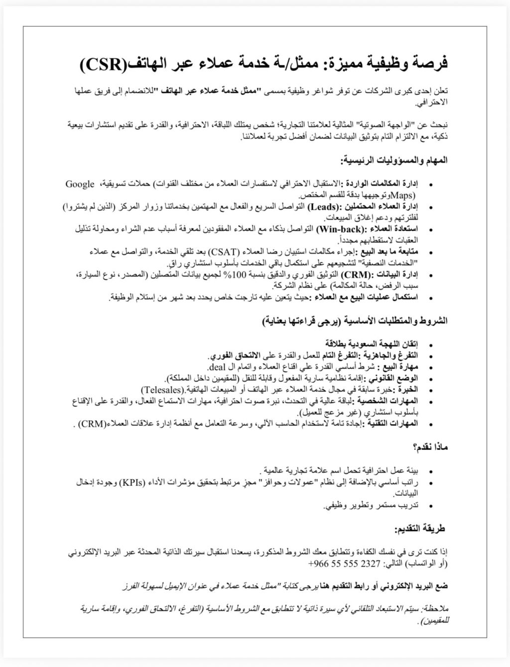مطلوب موظف كول سنتر وخبير في أقفال الديل مع العميل للعمل في مركز عناية بالسيارات في شرق الرياض حي القادسية يشترط تطابق الشروط المرفقة بالاعلان