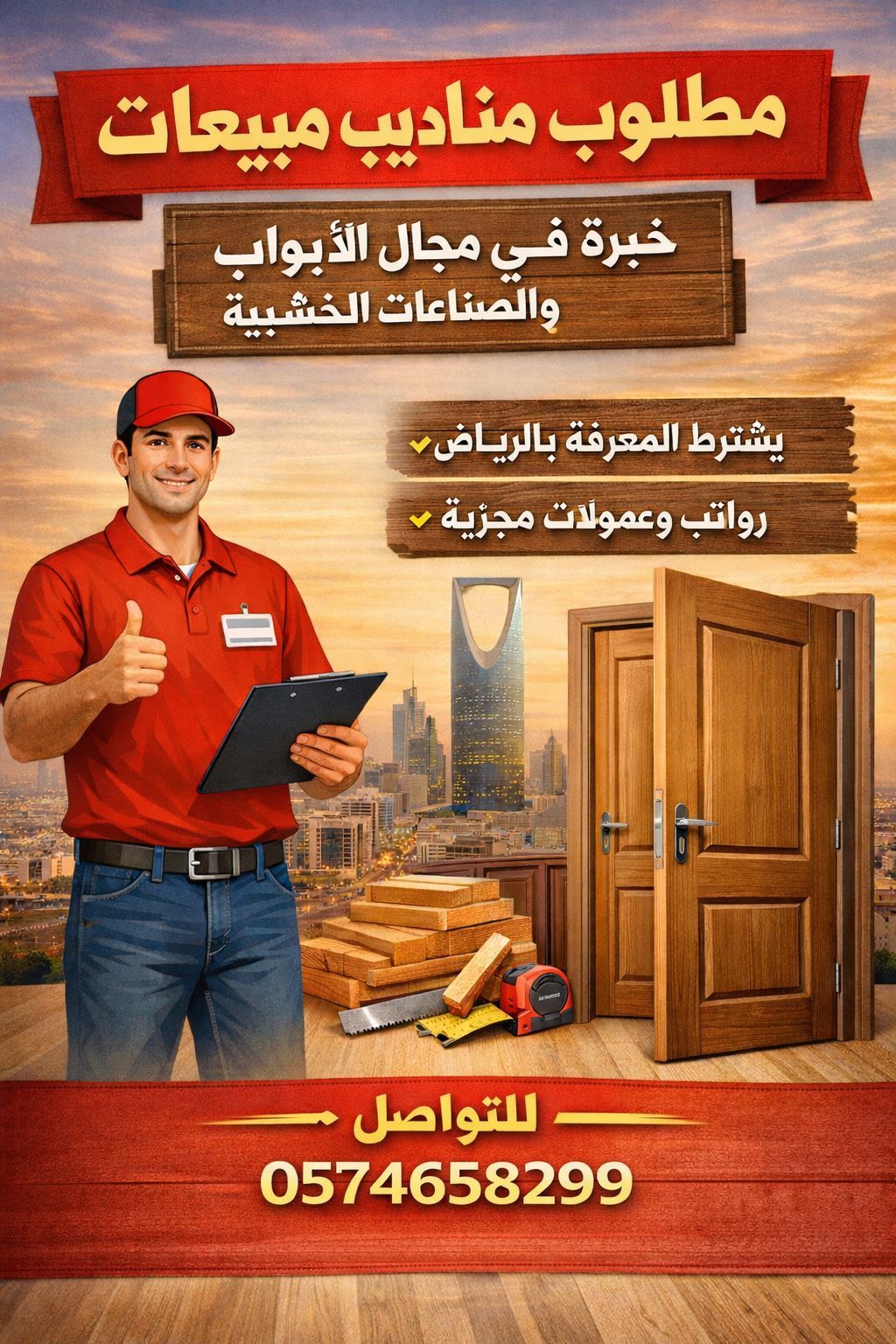 مطلوب مندوبين مبيعات - خبرة في الأبواب والديكورات الخشبية (الرياض) نبحث عن مندوبين مبيعات ذوي خبرة سابقة في مجال بيع الأبواب والديكورات الخشبية. الشروط معرفة تامة بأحياء وطرق الرياض. لديك قاعدة عملاء خاصة بك (مقاولين / مصممين / شركات مقاولات) القدرة على تحقيق أهداف المبيعات