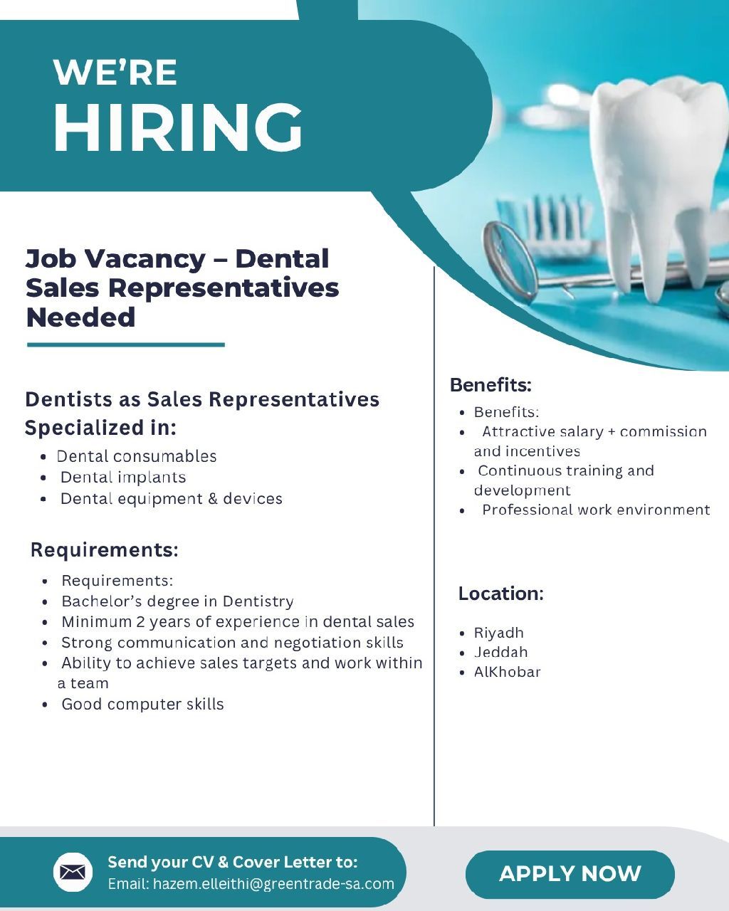 Job Vacancy - Dental Sales Representatives Needed A leading company in the dental supplies field is looking to hire Dentists as Sales Representatives Specialized in Dental consumables - Dental implants - Dental equipment & devices Requirements Bachelor’s degree in Dentistry - Minimum 2 years of experience in dental sales - Strong communication and negotiation skills - Abi
