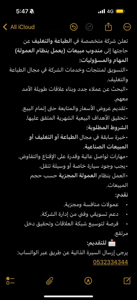 تعلن شركة متخصصة في الطباعة والتغليف عن حاجتها الى مندوب مبيعات (يعمل بنظام العمولة) المهام والمسؤوليات التسويق لمنتجات وخدمات الشركة في مجال الطباعة والتغليف. البحث عن عملاء جدد وبناء علاقات طويلة الأمد معهم. تقديم عروض الأسعار والمتابعة حتى اتمام البيع. تحقيق الأهداف البيعية الشهرية المتفق عليها. الشروط المطلوبة خبرة سابقة في مجال الطباعة أو التغليف أو المبيعات الصناعية