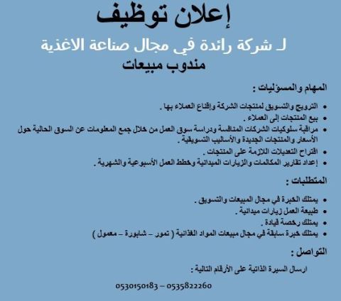 مطلوب مندوب مبيعات للعمل في مجال بيع وتوزيع زيوت السيارات بكافة أنواعها صناعة أمريكية على أن يكون الديه خبرة لا تقل عن 3 سنوات في نفس مجال تحديدا وتكون لديه قاعدة عملاء. مكان العمل مدينة الرياض. العنوان العزيزية شارع سبت العلايا رقم العنوان 8046 حي الدار البيضاء