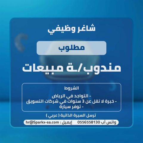 مطلوب مناديب مبيعات وتسويق ميداني (رجال - نساء) لوكالة تسويق رقمي الدور الوظيفي نبحث عن محترف مبيعات يمتلك "مفاتيح السوق" وخبرة عميقة في شركات التسويق، قادر على بناء جسور الثقة مع العملاء وتحويل الفرص الى نجاحات ملموسة. المتطلبات خبرة لا تقل عن 3 سنوات في السوق السعودي الرياض، امتلاك سيارة وقاعدة عملاء قوية ونشطة في الرياض. مهارات استثنائية في التفاوض والاغلاق (Closing Skills) المكان الرياض، شارع الجامعة