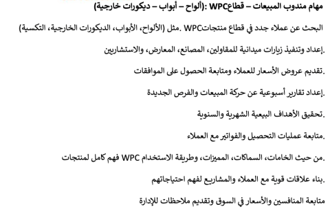 تعلن شركة تعمل في مجال تصنيع منتجات أل WPC (خشب بلاستيك) عن حاجتها الى مندوب مبيعات (field Sales) الموقع الخرج - السعودية شرط أساسي خبرة مسبقة في بيع مواد التشطيب مثل أبواب WPC / PVC، ديكنغ، كلادنغ، بروفايلات، مواد ديكور خارجية) الشروط خبرة 2 - 3 سنوات في مجال مشابه القدرة على العمل الميداني وزيارة العملاء مهارات تواصل ممتازة يفضل من لديه علاقات مع محلات مواد البناء والمقاولين إقامة سارية داخل السعودية