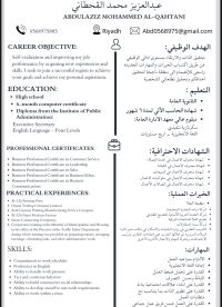الاسم عبدالعزيز القحطاني المؤهل خريج معهد الادارة العامة بتخصص سكرتير تنفيذي ابحث عن فرصة وظيفية في أي جهة حكومية أو خاصة تناسب مؤهلاتي وأسال الله التوفيق والسداد