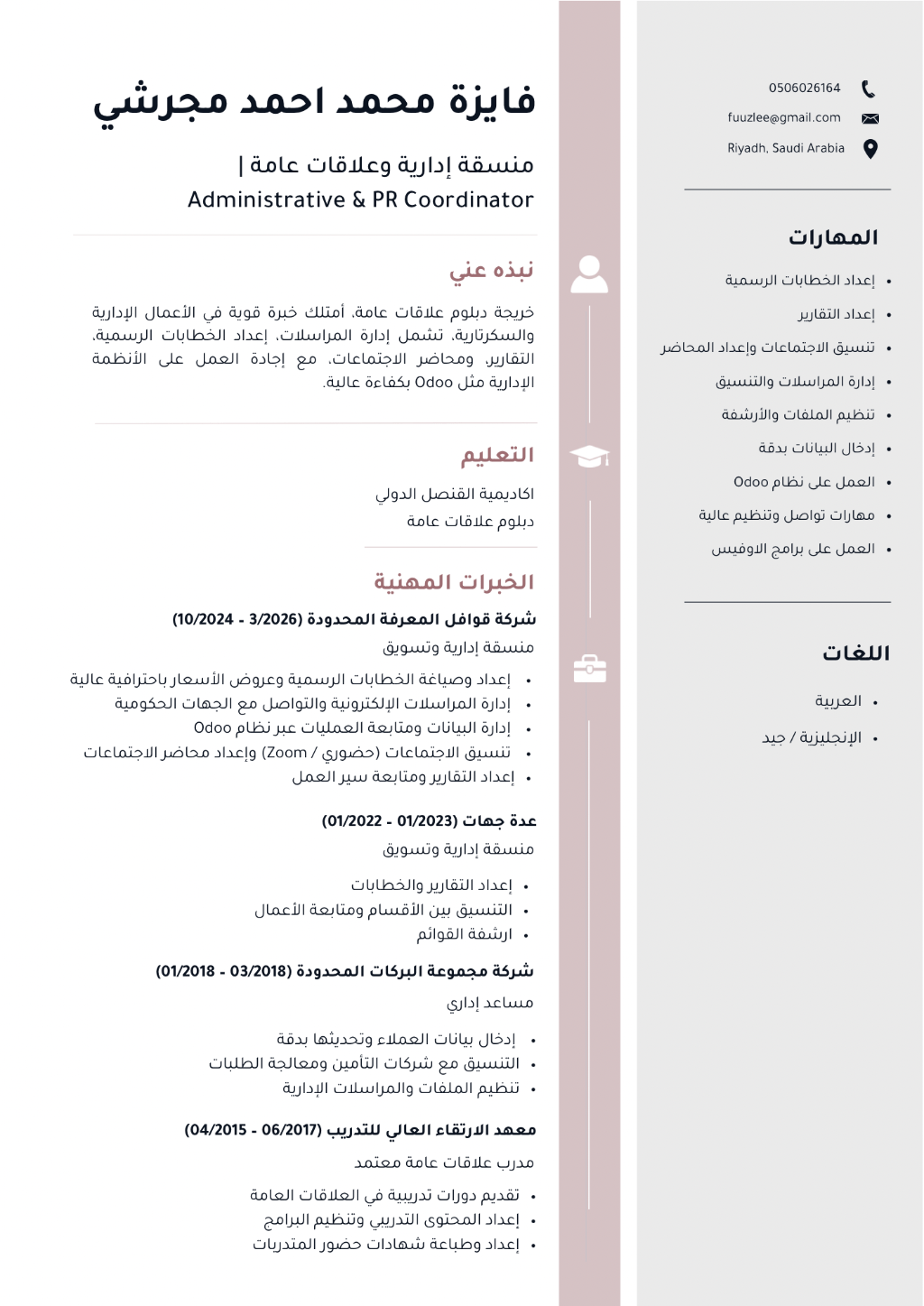 منسقة ادارية سعودية في الرياض - مستعدة وجاهزة للعمل فورا خريجة علاقات عامة، لدي خبرة في الأعمال الادارية والسكرتارية، تشمل اعداد وصياغة الخطابات الرسمية والتقارير، إدارة المراسلات، وتنظيم الاجتماعات واعداد محاضرها باحترافية. أجيد العمل على الحاسب والأنظمة المكتبية، وأسعى للحصول على فرصة وظيفية مناسبة. الجنسية سعودية الموقع الرياض السيرة الذاتية مرفقة