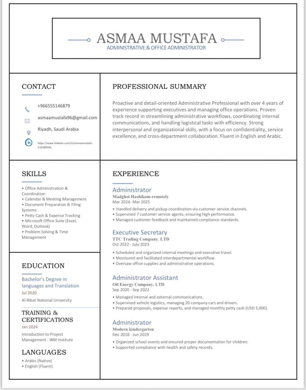 Professional Administrative Assistant with 4 years of experience in office management, correspondence, scheduling, and administrative coordination. Fluent in English and Arabic, detail - oriented, and skilled in Microsoft Office programs. Looking for a full time opportunity in Riyadh Ready to join immediately
