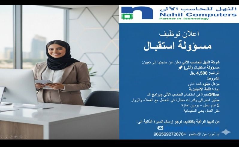 شركة النهل للحاسب الآلي تعلن عن حاجتها الى تعيين مسؤولة استقبال (أنثى) أنثي الشروط مؤهل دبلوم كحد أدنى اجادة اللغة الانجليزية خبرة في استخدام الحاسب الآلي وبرامج أل Office مظهر احترافي وقدرات ممتازة في التعامل مع العملاء والزوار 5 أيام عمل - يومين اجازة الراتب 4500 ريال مقر العمل بحي السليمانية - الرياض